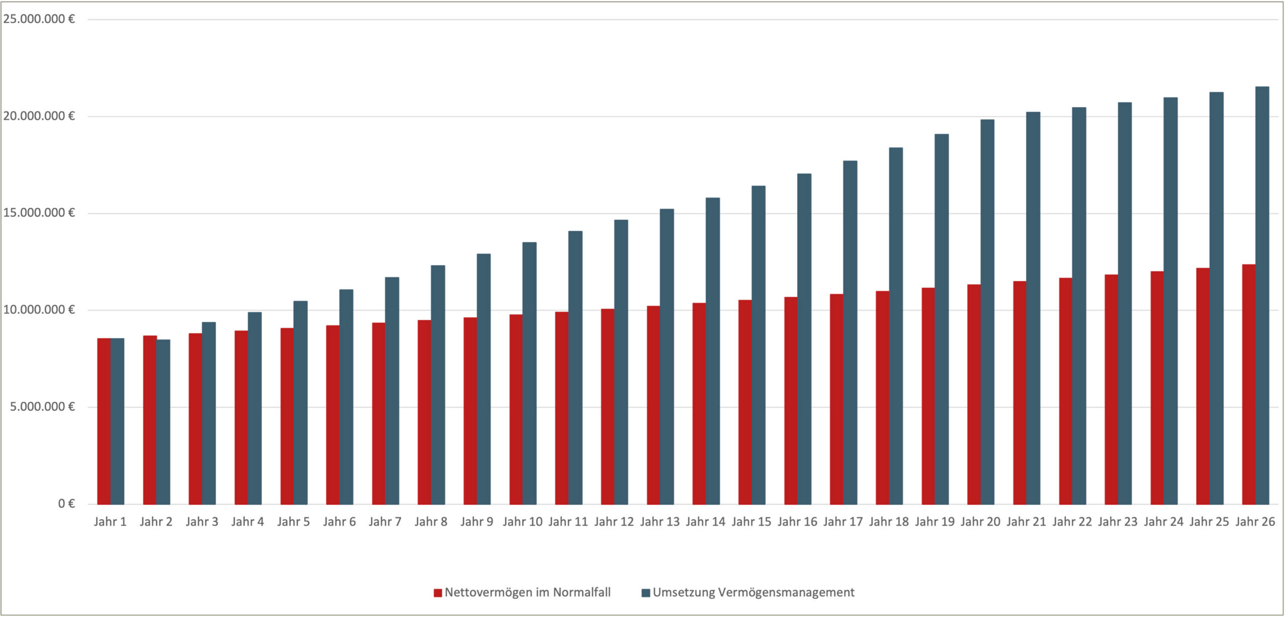 Die Grafik zeigt die Entwicklung des Gesamtvermögens über die kommenden Jahre - einmal im aktuellen Zustand (rote Balken) und einmal nach Umsetzung der empfohlenen Anlagestruktur (blaue Balken). Im Status Quo ist das gesamte Vermögen in Liquidität gebunden. Dadurch bleibt die Wertentwicklung über die Jahre nahezu unverändert, da keine Renditequellen aus Sachwerten oder Kapitalmarktanlagen genutzt werden. In der optimierten Variante wird das liquide Vermögen in Wohnimmobilien, Private Equity-Beteiligungen, globale Aktienmärkte und Gold umgeschichtet. Diese strategische Neuausrichtung sorgt für eine deutlich dynamische Vermögensentwicklung und nutzt das Renditepotenzial verschiedener Anlageklassen gezielt aus.